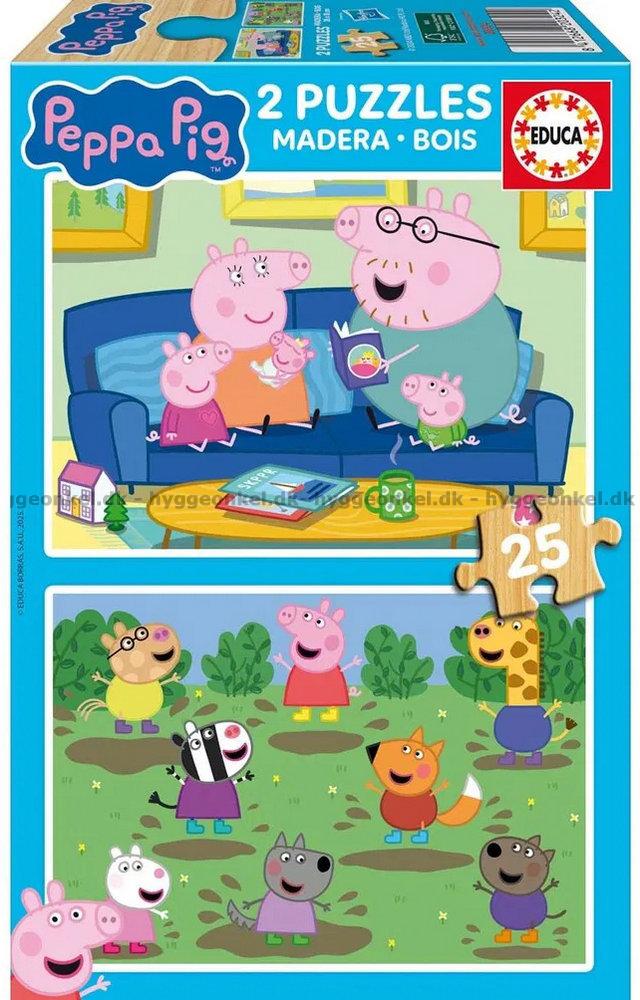- Pusslen är i trä. Du får 2 pussel, varje med 25 bitar, i en ask. Motiven rekommenderas från 4 år
