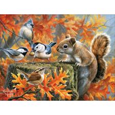 - Ett ekorre och en rad fåglar har samlats vid trädstubben, där alla kämpar om höstens sista nötter