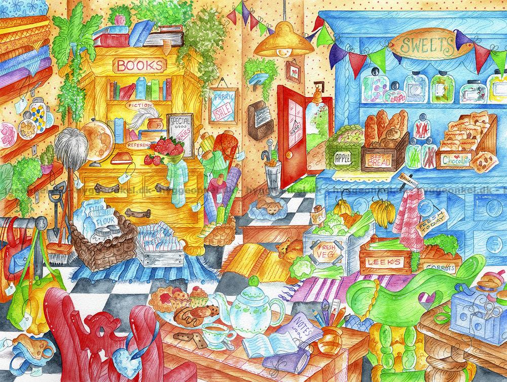 - Utforska den spännande och färgglada butiken. Här hittar du sötsaker, böcker och färska grönsaker