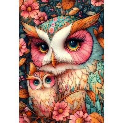 - Två färgglada ugglor sitter tätt tillsammans. De stora uttrycksfulla ögonen tittar ut