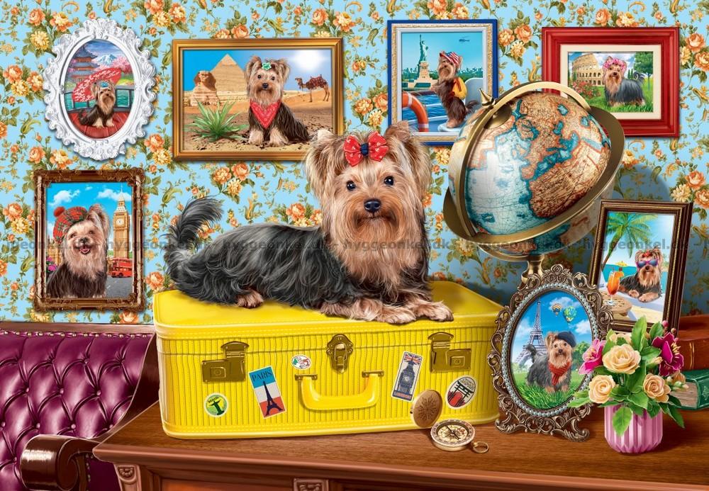 - Den charmiga Yorkshireterriern sitter på en gul resväska, omgiven av reseminnen från hela världen