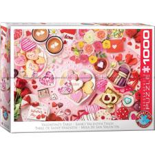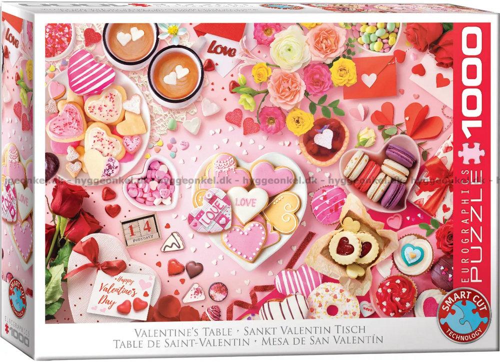 - Bordet är dukat med hjärtformade småkakor, färgglada macarons