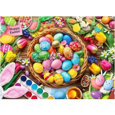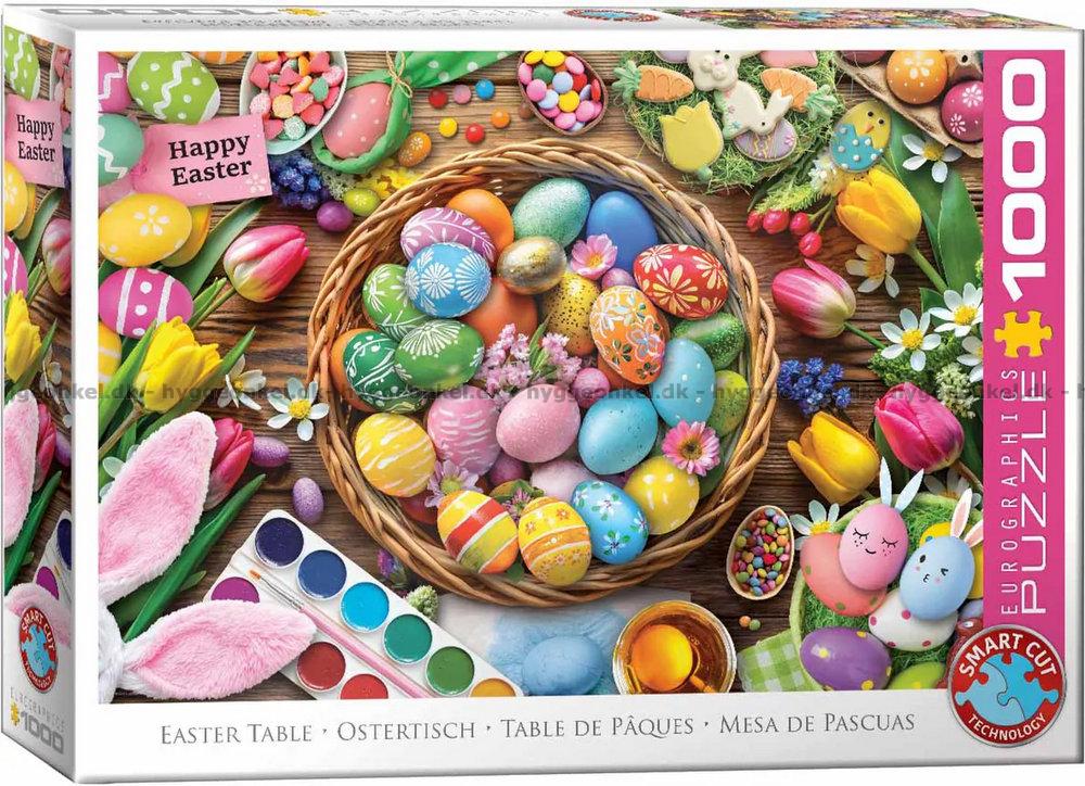 - Runt korgen ligger tulpaner, ägg och färg för att dekorera äggen med