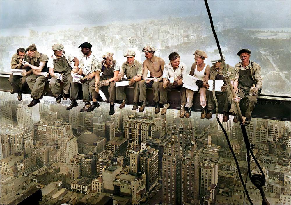 - Fotografiet togs 1932 av en okänd fotograf som står på 69:e våningen i Rockefeller-byggnaden