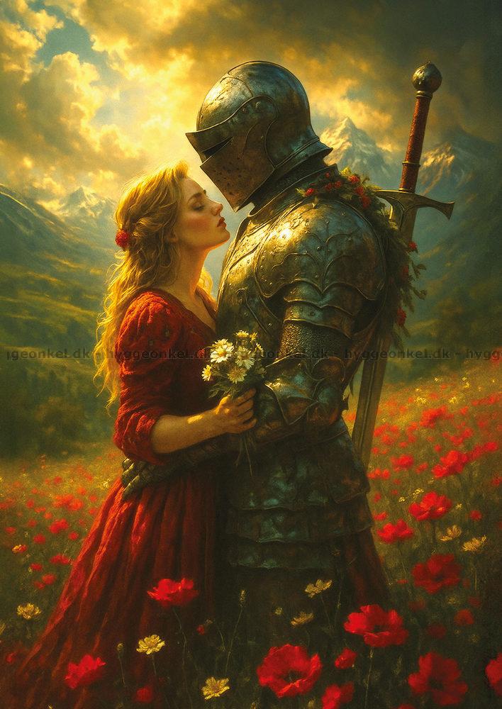 - Riddaren i skinande rustning står nära kvinnan i en röd klänning