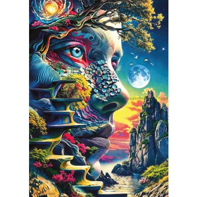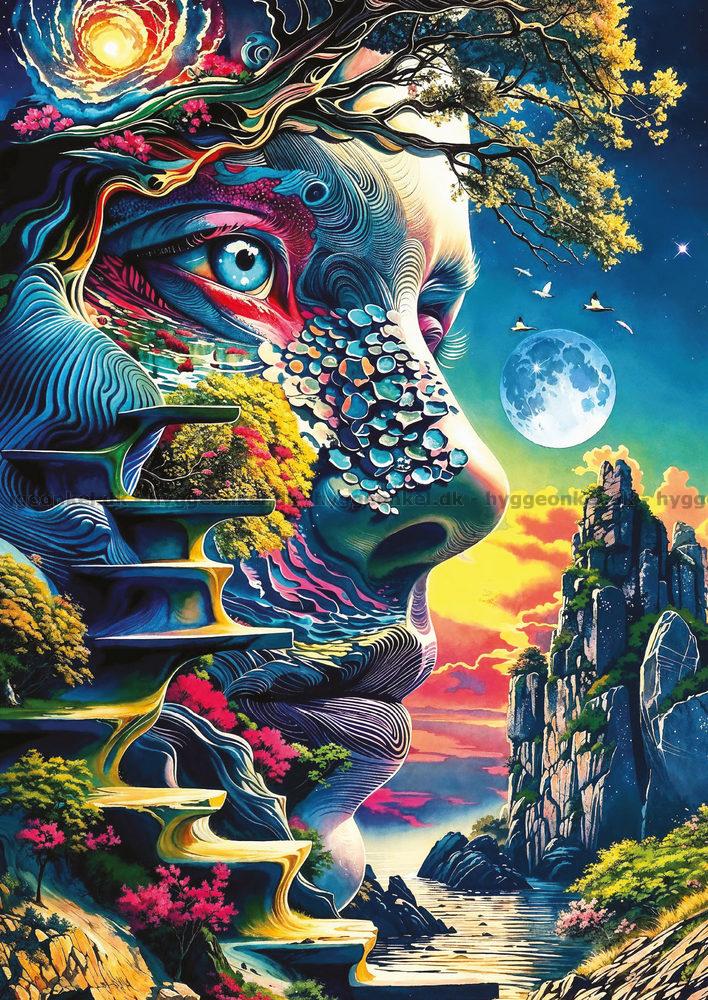 - Surrealistisk sammansmältning av natur och människa, där ansiktet är integrerat i ett landskap