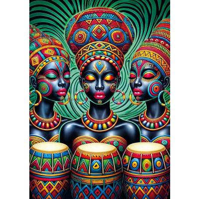 - Framför dem står tre trummor, som också är dekorerade i vackra mönster
