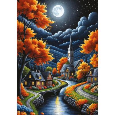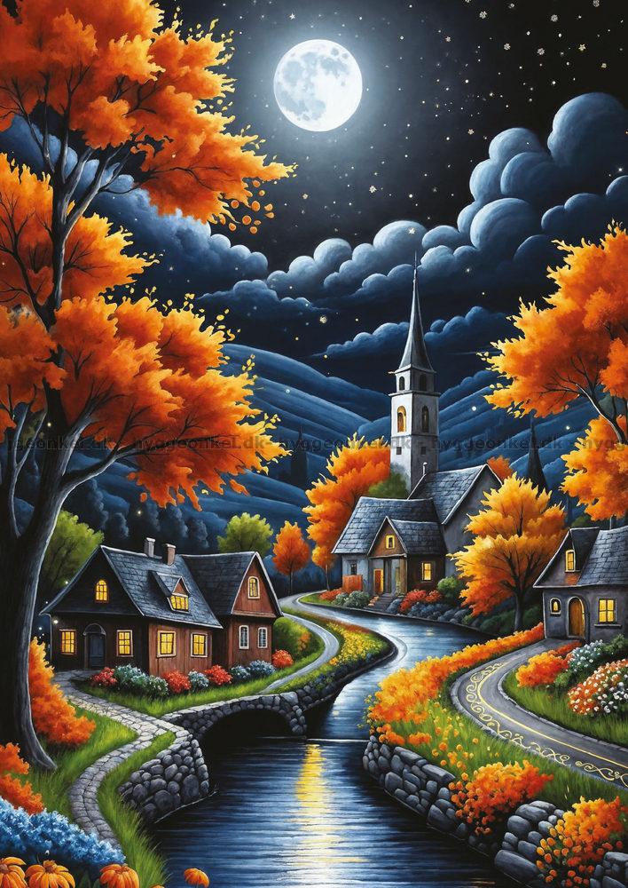 - Den upplysta månen kastar sitt ljus över de färgglada höstträden och den stilla floden