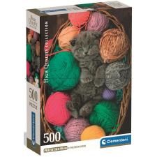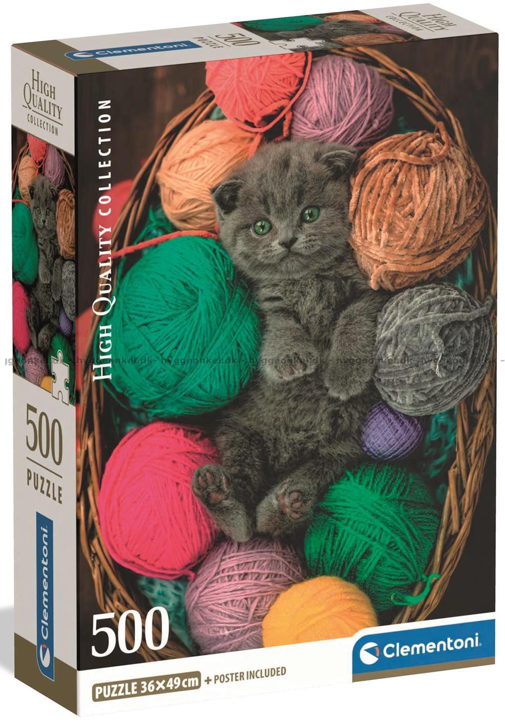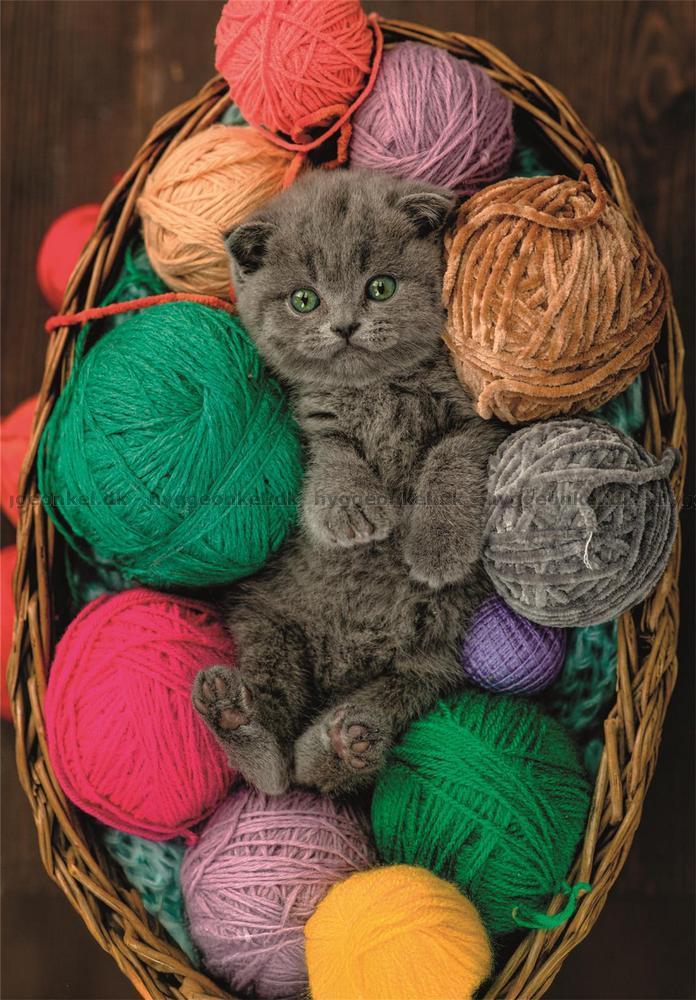 - Den gråa kattungen ligger och tittar ut med sina gröna ögon