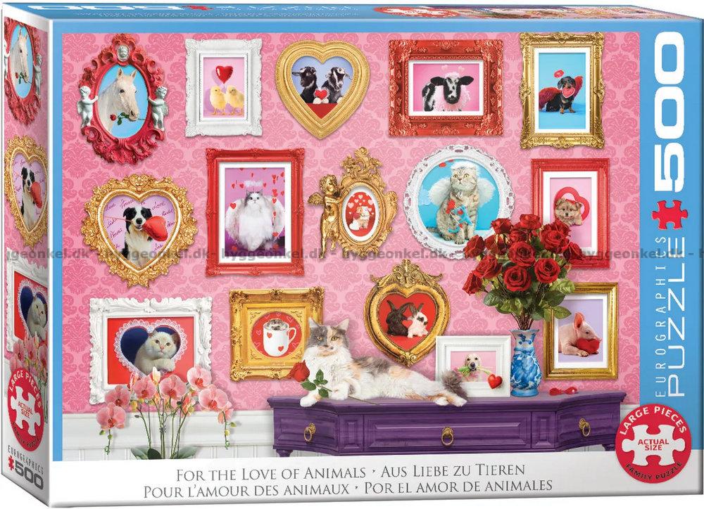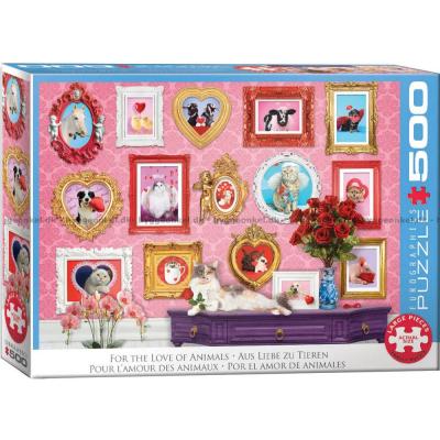 - På väggen hänger en lång rad färgglada fotoramar med härliga husdjur