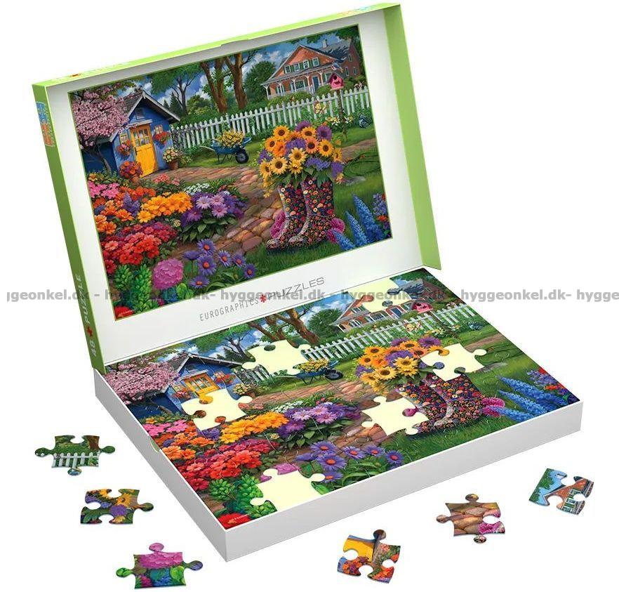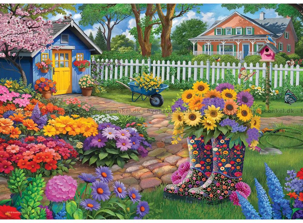 - Ett par gummistövlar står mitt i trädgården och svämmar över av solrosor. Runt om i trädgården är rabatterna fyllda med färgglada blommor.