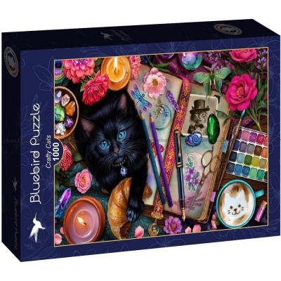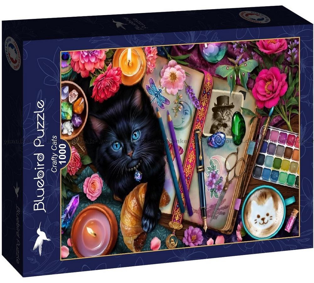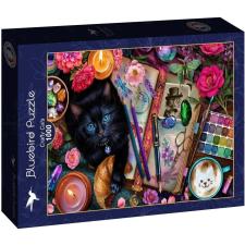 - Katten vilar sig mitt på bordet, omgiven av blommor, färgpennor, penslar och en öppen anteckningsbok med teckningar och ett gammalt foto av en katt med hög hatt