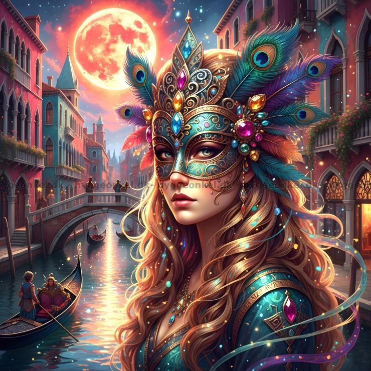 - Den unga kvinnan står med en överdådig mask fylld med färgglada fjädrar och juveler. Bakom henne syns en av stadens många kanaler