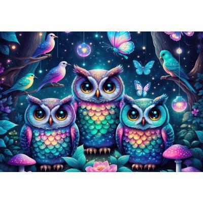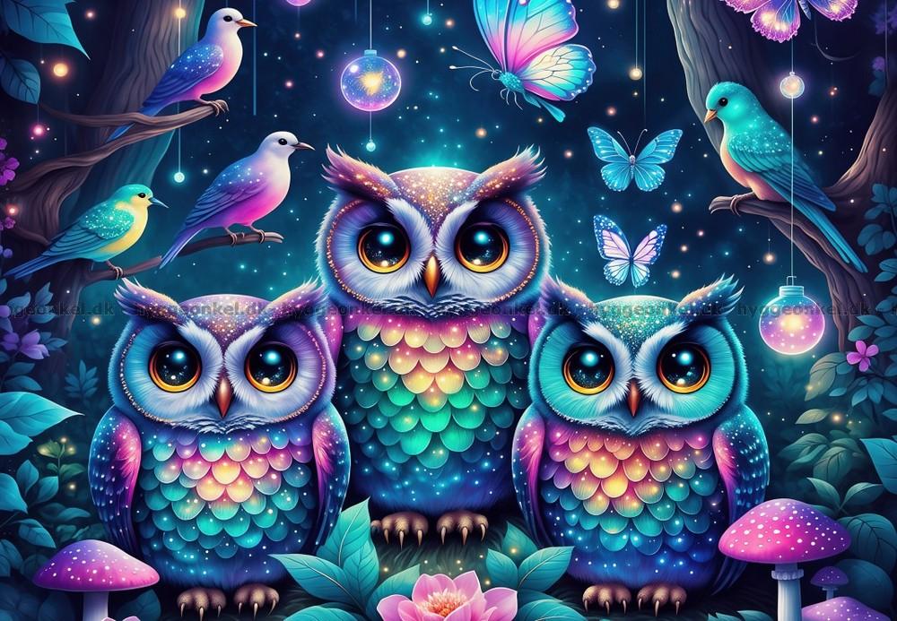 - Tre färgglada ugglor med stora, glittrande ögon sitter tätt tillsammans