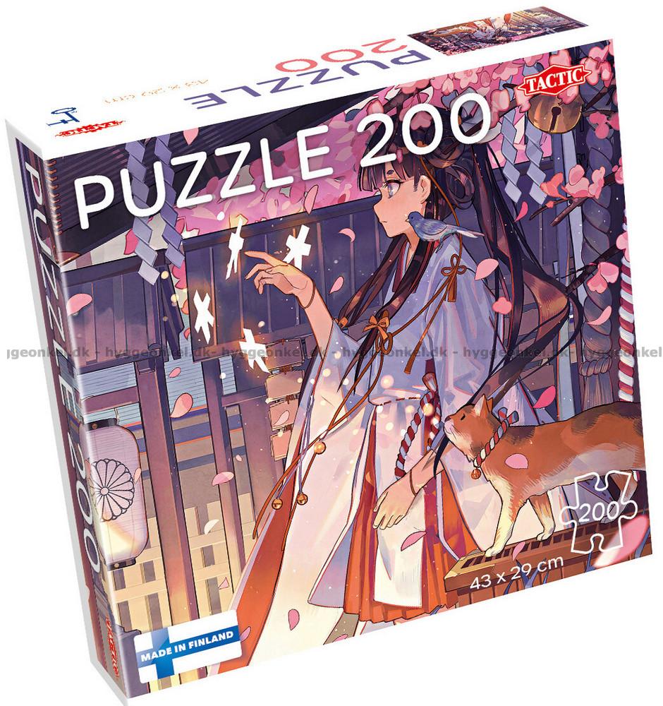 - Den unga flickan står under det blommande körsbärsträdet. Hon bär en traditionell kimono