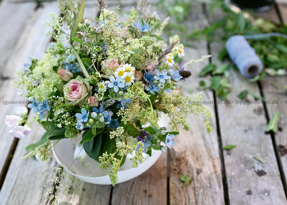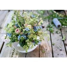 - Buketten består av vilda blommor i ljusblå, vita, ljusrosa och gröna nyanser, blandade med fina grässtrån och blad