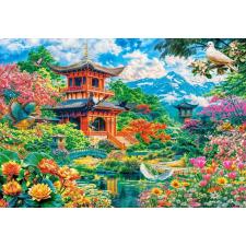- I trädgården ligger det orientaliska templet omgivet av blommor, fåglar och berg
