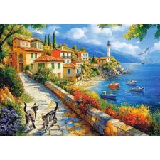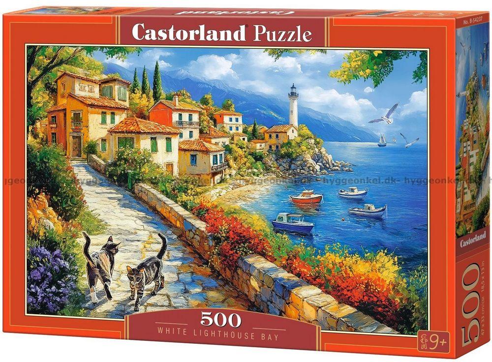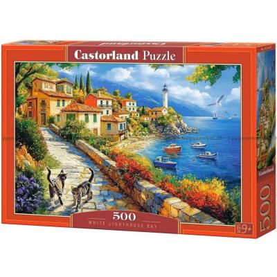 - Ett vitt fyrtorn står på en klippa, medan små båtar gungar i det klara vattnet