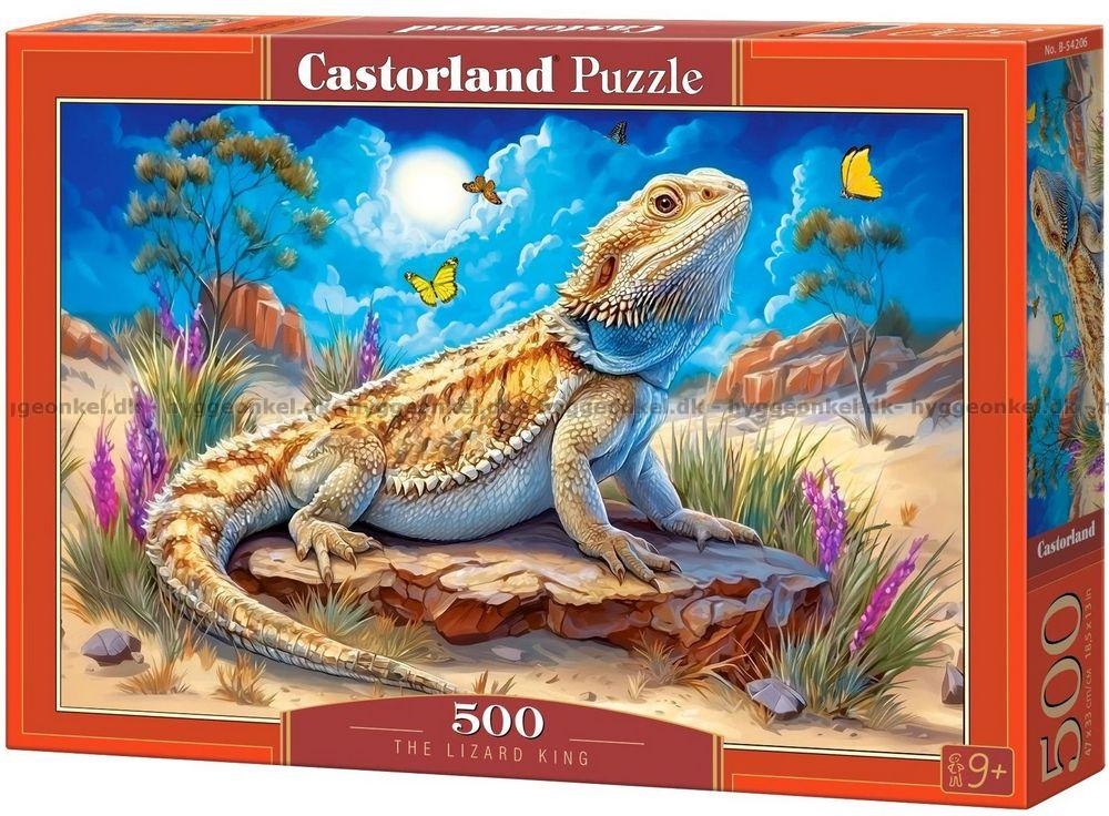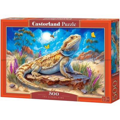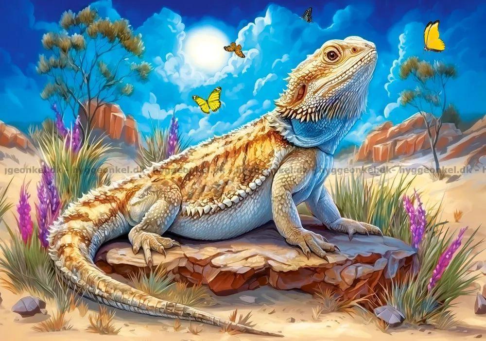 - Den stora ödlan sitter majestätiskt på en sten mitt i det färgstarka ökenlandskapet