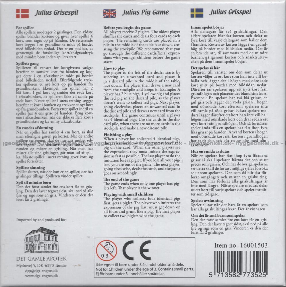 I Julius Grisspel gäller det att samla 4 likadana kort med grisar på. Grisarna gör olika grimaser på korten.