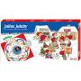 Spelbräde, tärningar, pjäser, kort och pengasedlar.
