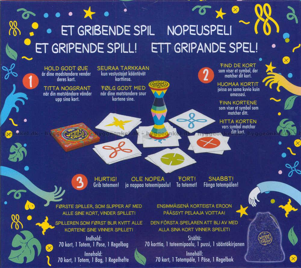 Asken innehåller 70 kort, en totempåle i trä, svenska spelregler och en påse att förvara alla komponenter i.