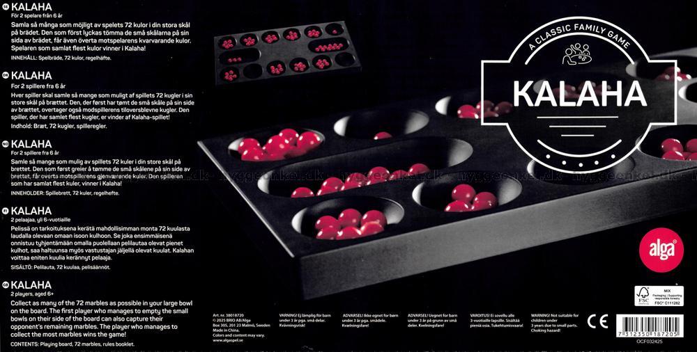 Kartongen innehåller ett kalahabräde i robust plast. Brädet mäter cirka 41 x 20 cm. Därutöver inkluderas ett set röda kulor. Kulorna har en diameter på cirka 1,3 cm.