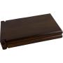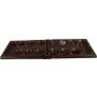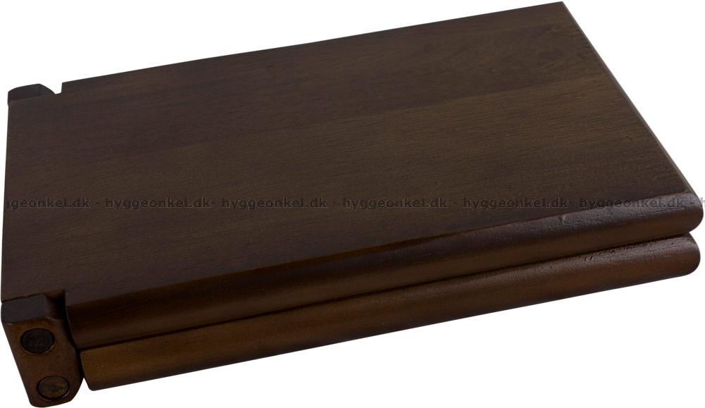 Spelbräde i mörkt trä som kan fällas ihop när det inte används. Det finns ett litet, praktiskt lås med magnet.
