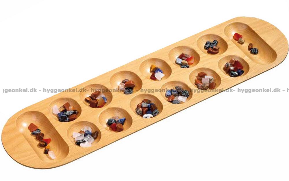 Här får du det klassiska spelet Kalaha i en vacker utgåva i trä med stenpjäser.