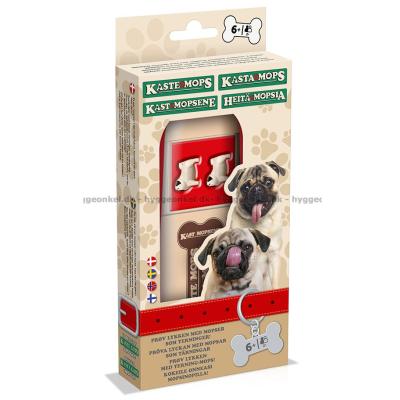 I förpackningen för detta exemplar av Kasta gris får du en fin liten box i grå plast. I den hittar du de två kända grisarna, 2 blyertspennor, poängblock samt spelregler så att du vet hur många poäng de olika kombinationerna ger.