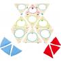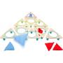 9 trekanter i trä. Trekanterna har en sidlängd på 18 cm. Hålen i mitten på trekanterna har en diameter på 8 cm.