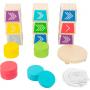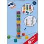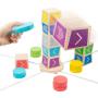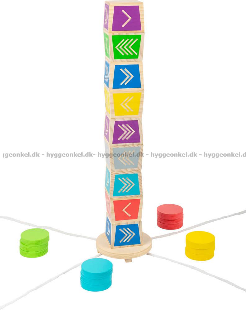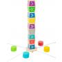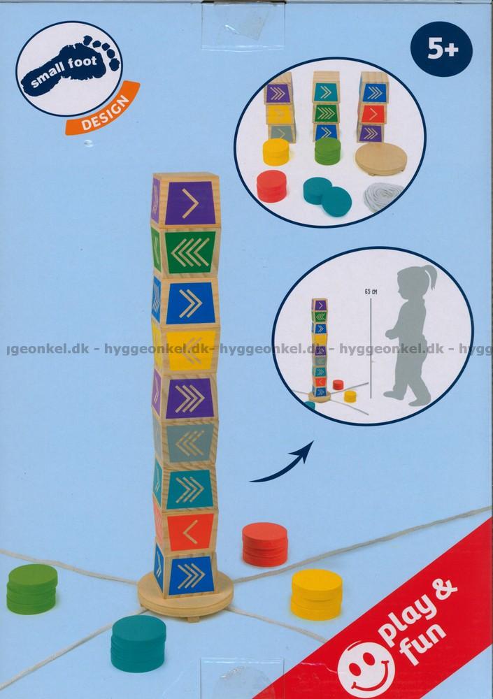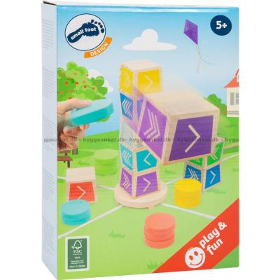 Bygg på höjden med dessa fina och färgglada klossar. Målet är att träffa den översta klossen med en av de runda träpuckar som följer med i spelet.