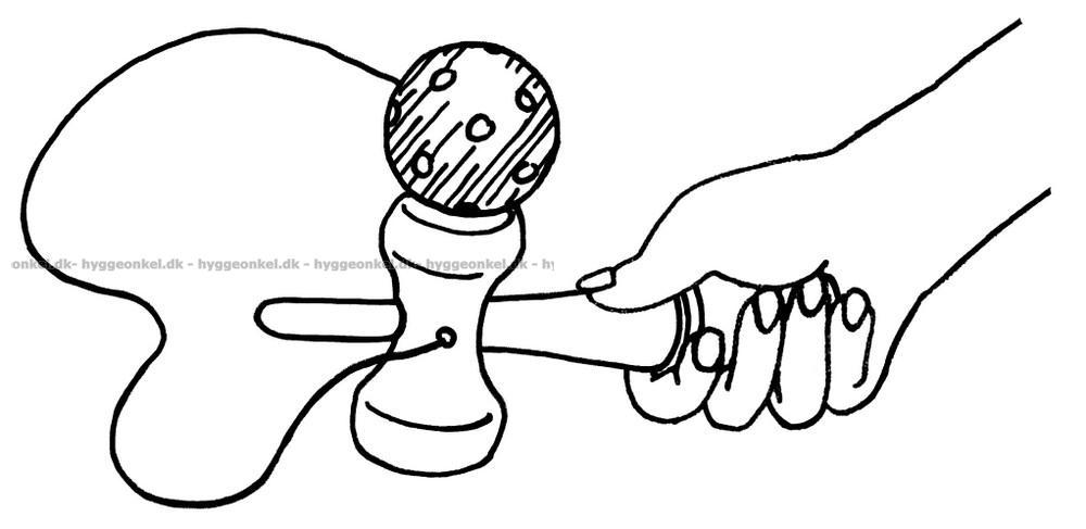 På handtaget finns tre konkava koppar - en liten och en stor längst upp samt en ännu mindre i själva greppet på handtaget.