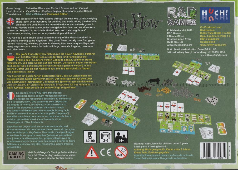 Key Flow är ett kortdrivet spel baserat på många av de idéer som används i det prisbelönta Keyflower. Spelet avlöper snabbt under fyra spelrundor (årstider), under vilka spelarna har möjlighet att bygga sina unika byar. Det finns många sätt att samla poäng för byggnader, djur, keyples, resurser och annat.