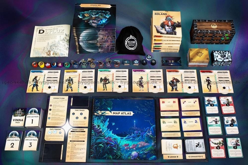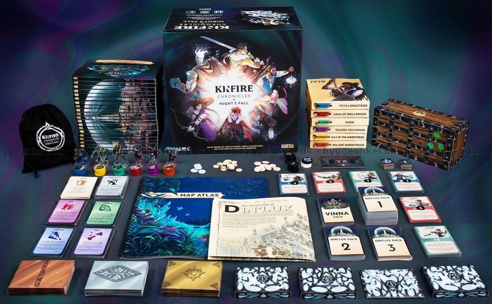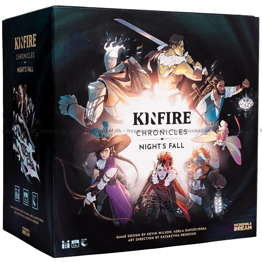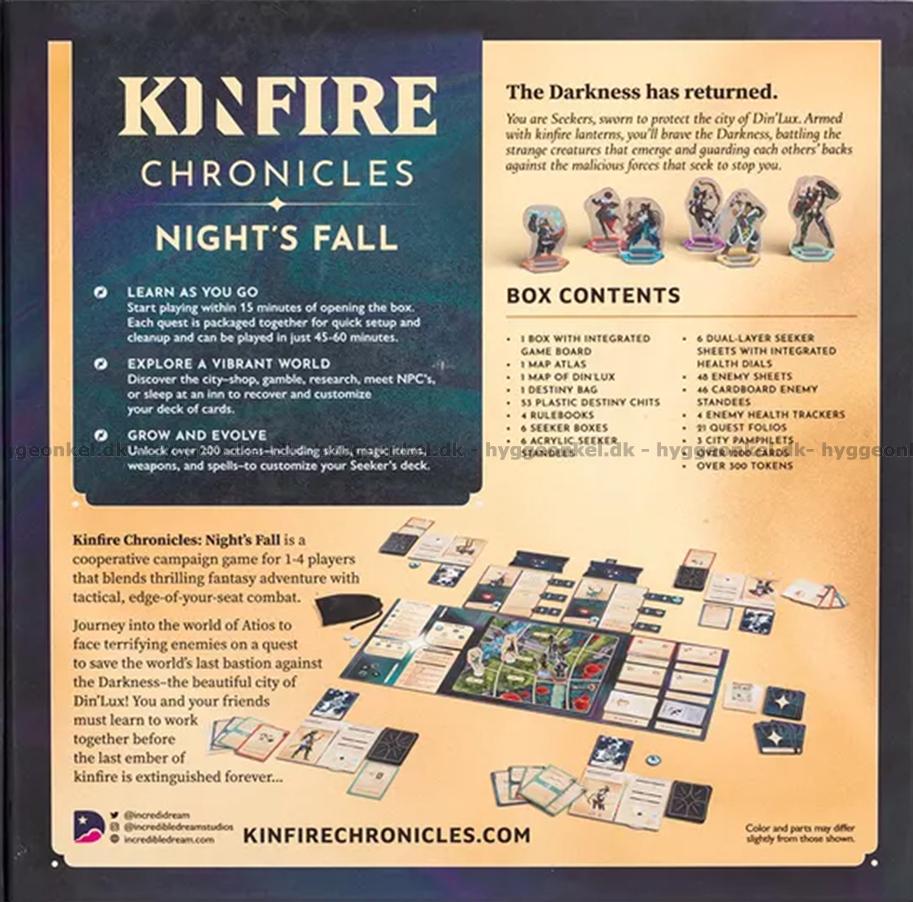 Samarbete är nyckeln i Kinfire Chronicles: Night's Fall. Ni måste fatta strategiska beslut som grupp och stötta varandra i strid för att övervinna de utmaningar ni ställs inför. Spelet innehåller vackert designade komponenter, inklusive detaljerade hjältefigurer, spelkort och en spelplan som ger varje hjältes förmågor och historia liv.