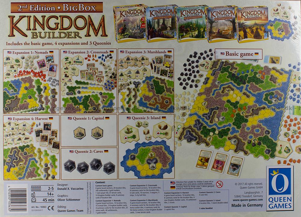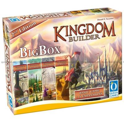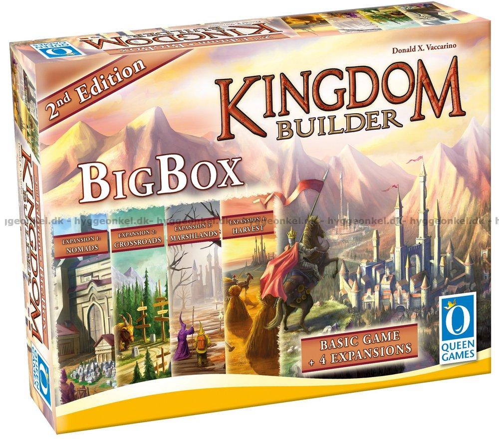 Här får du det populära strategispelet Kingdom Builder i en mycket trevlig Big Box-utgåva. Förutom grundspelet innehåller boxen också expansionerna "Nomads", "Marshlands", "Harvest" och "Crossroads" samt 3 "queenies".