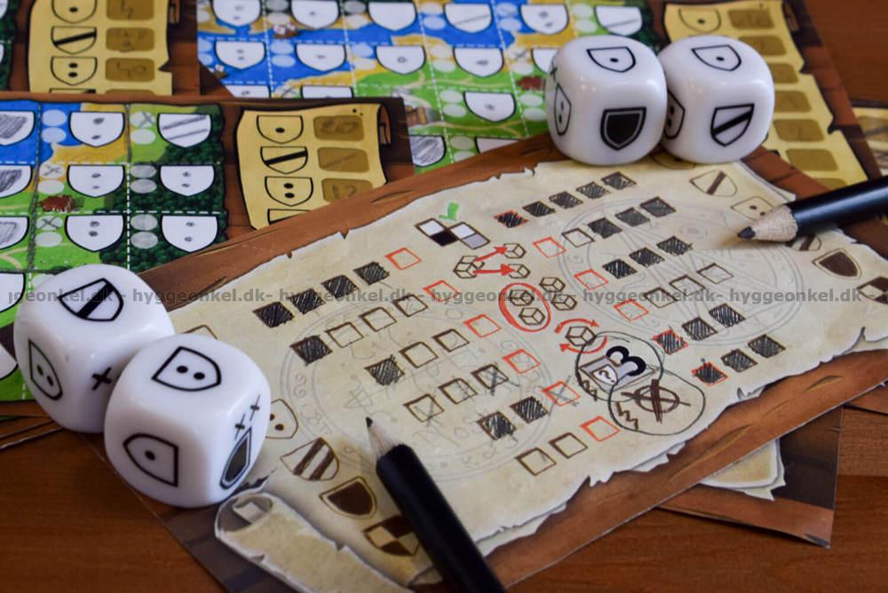 4 specialtärningar, 2 blyertspennor och 1 poängblock.