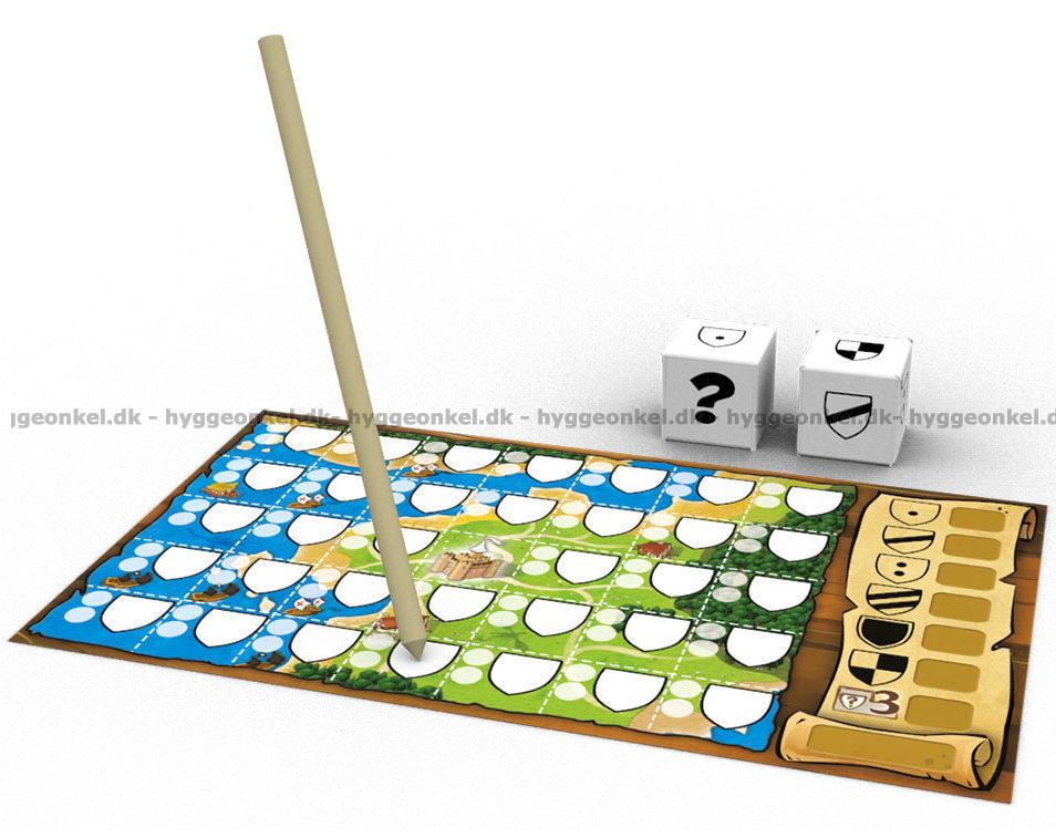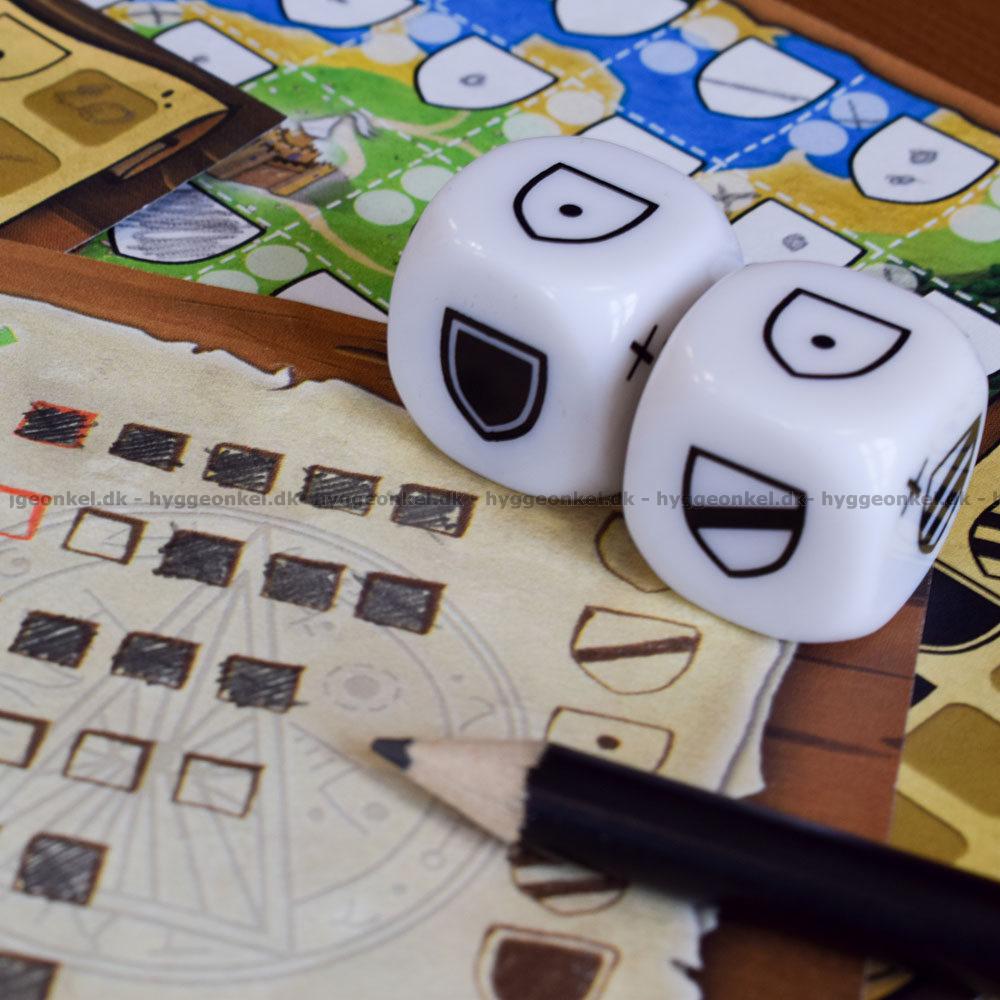 4 specialtärningar, 2 blyertspennor och 1 poängblock.
