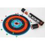 Spelmatta som kan rullas ihop (mäter cirka 50 cm i diameter), 15 röda och 15 gröna brickor (mäter 2,2 cm i diameter och är 0,6 cm höga).