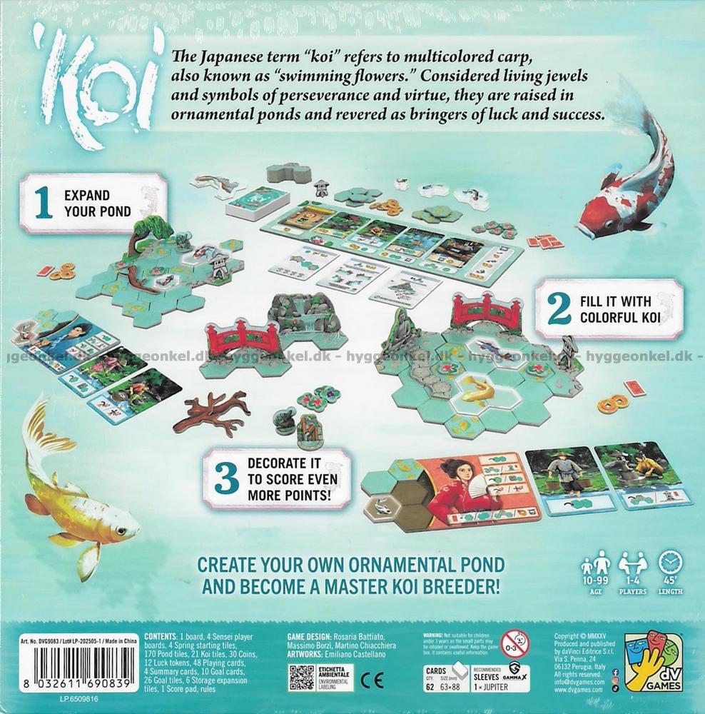I Koi tävlar spelarna om att skapa den vackraste och mest harmoniska koi-dammen. Koi beskrivs ofta som “simmade blommor” – färgsprakande och lyckobringande karpar, som i spelet blir centrum för din egen lilla vattenoas. Varje tur utvidgar du dammen med vattenrutor, växter, näckrosor och lyktor, samtidigt som du föder upp koi i olika storlekar. Varje bricka måste placeras enligt exakta regler, och koi ger poäng utifrån både storlek, omgivande vatten och angränsande näckrosor.