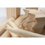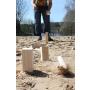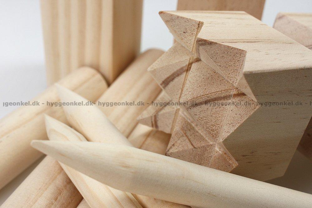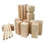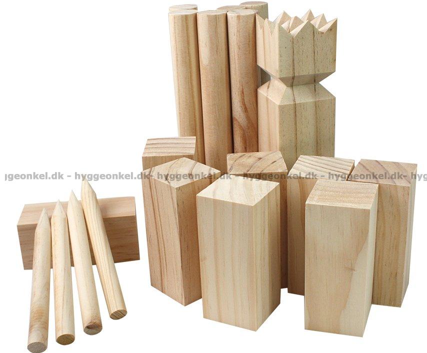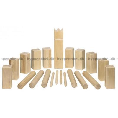 1 kung (20 x 5 x 5 cm), 10 kubbar (10 x 4 x 4 cm), 6 runda kastpinnar (20 x 2,5 cm) och fyra pinnar för att markera banan (15 x 1,5 cm).