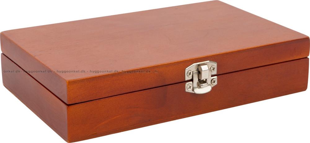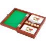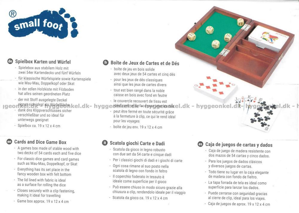 Här får du en träbox med två kortlekar och fem tärningar. Den mäter 18.5 x 11.5 x 4 cm.