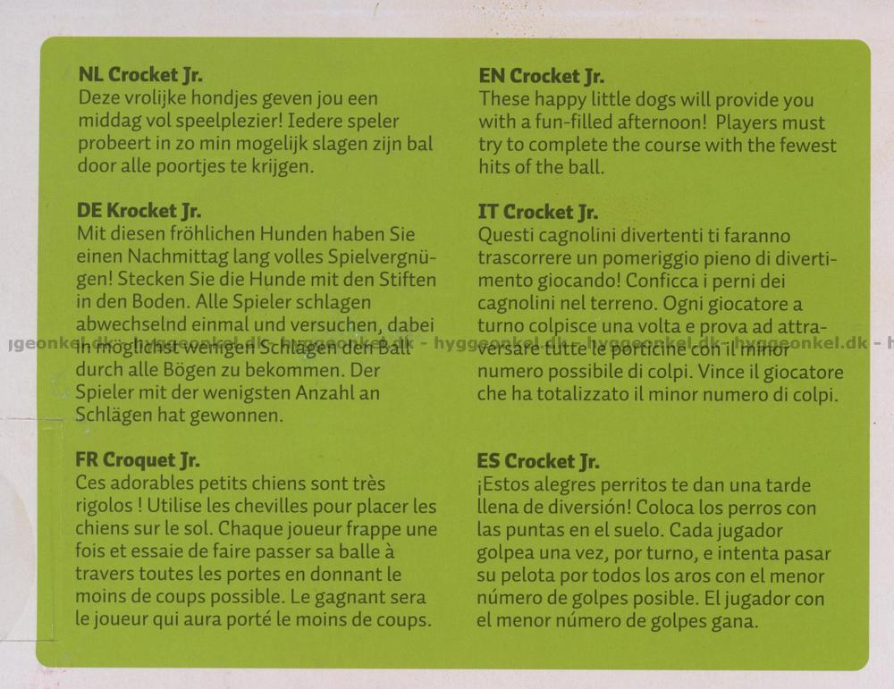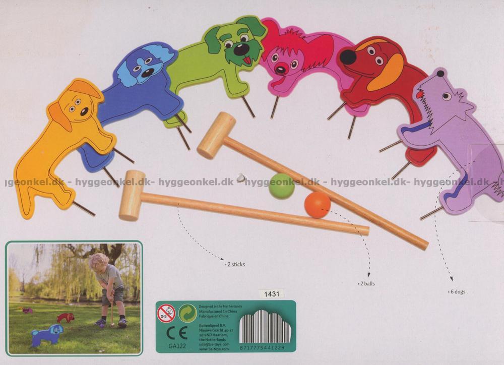 6 färgglada hundar i trä. Dessa hundar fungerar som portar som man ska slå bollen igenom. Hundarna är stora (cirka 21 cm breda - 15 cm höga - 1 cm tjocka) och mycket färgglada. Under varje hund finns två stycken metallstänger så de sitter stabilt i jorden.
