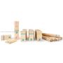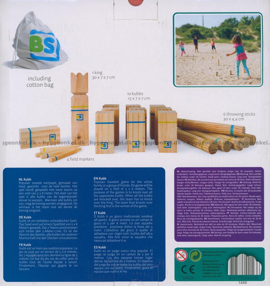 1 kung (7 x 7 x 30 cm) - 10 kubbar (7 x 7 x 15 cm) - 6 runda kastpinnar (4 x 30 cm) - 4 pinnar för markering av banan (1,5 x 15 cm) - en tygväska för transport och förvaring.