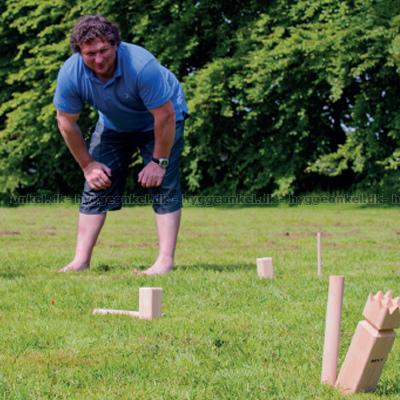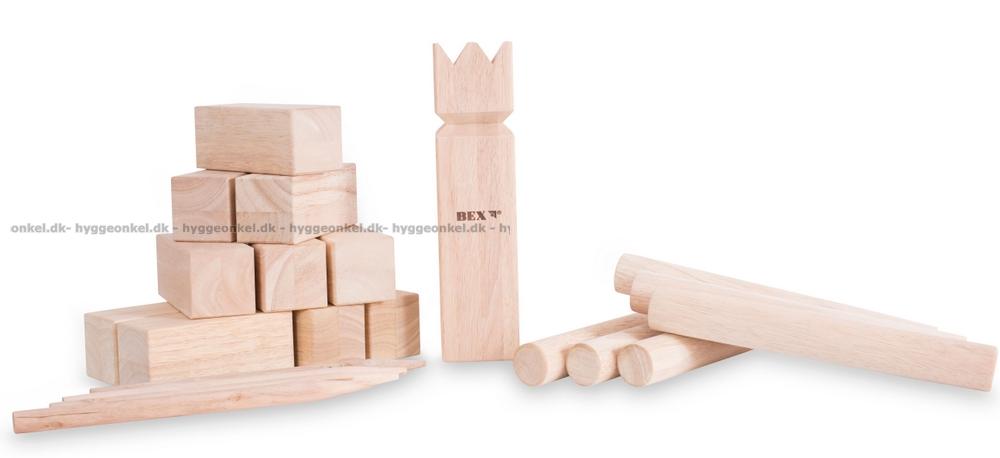 1 kung (7 x 7 x 30 cm) - 10 kubbar (5,5 x 5,5 x 15 cm) - 6 runda kastpinnar (4 x 30 cm) - 4 pinnar för markering av banan (2 x 30 cm) - en väska för transport och förvaring.