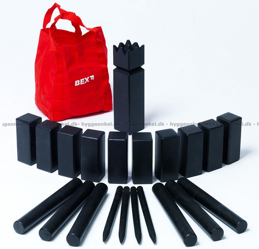 1 svart kung (7 x 7 x 30 cm) - 10 svarta kubbar (5,5 x 5,5 x 15 cm) - 6 svarta, runda kastpinnar (4 x 30 cm) - 4 svarta pinnar för markering av banan (2 x 30 cm) - en väska för transport och förvaring.