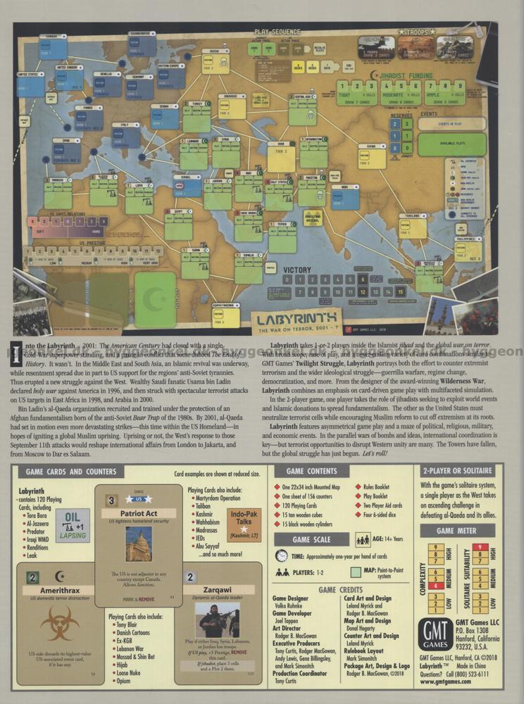 Labyrinth tar med 1-2 spelare till världen med islamistisk Jihad och det globala kriget mot terrorismen. Med sin breda spännvidd, sina enkla regler och sin stora variation tack vare kortkombinationerna (i stil med GMT Games Twilight Struggle), skildrar Labyrinth både kampen mot extremistisk terrorism och den större ideologiska konflikten - guerillakrig, regimers fall, demokratisering och mycket mer. Labyrinth kombinerar ett kortdrivet spel med mångfacetterad simulering.