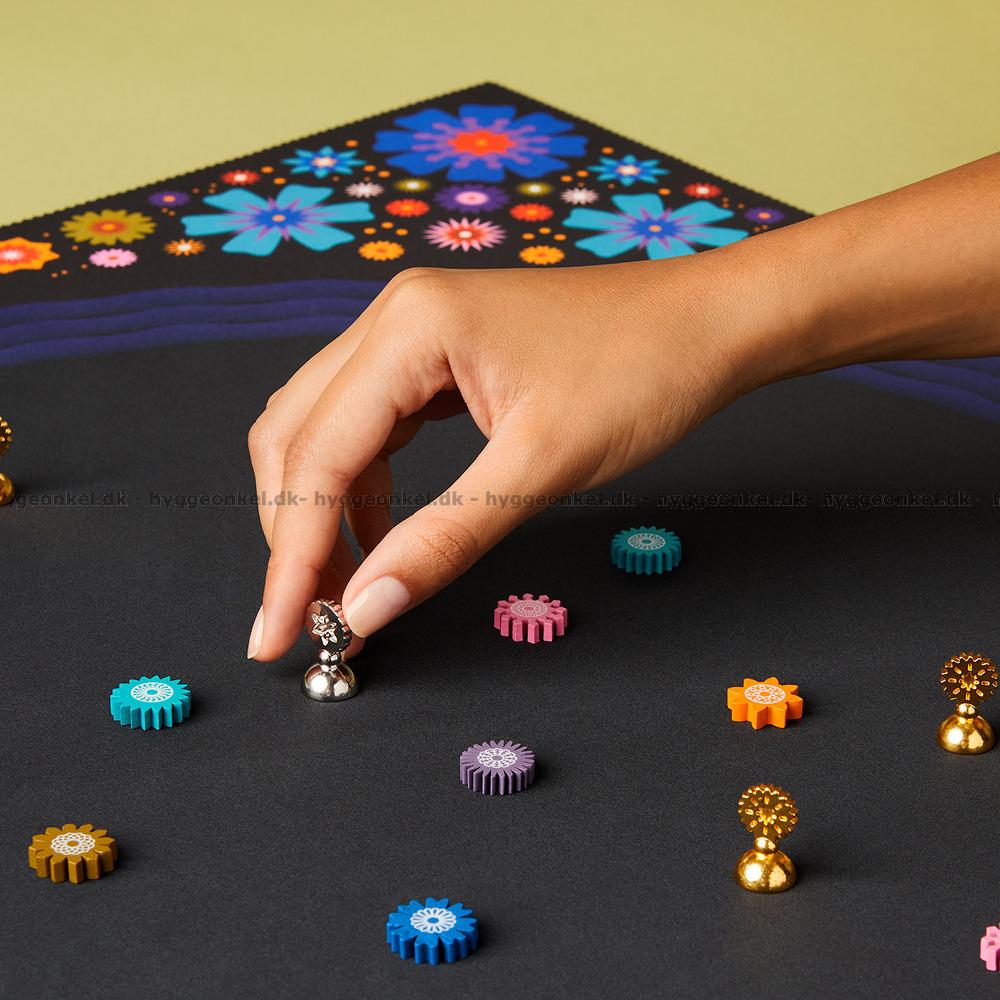 Med era sex brickor i guld eller silver rör ni er varsamt in i detta nattliga landskap. Ni avläser avståndet mellan blommorna och ser de osynliga linjer som förbinder dem, som om ni ritar mönster i mörkret. Det är en stillsam duell där närvaro och precision skapar spänning, och där varje val känns som en rörelse på vattnets spegelblanka yta.