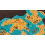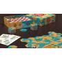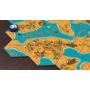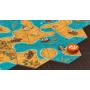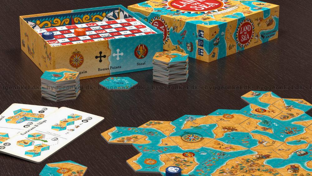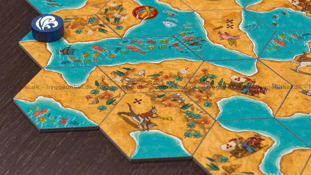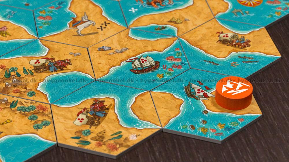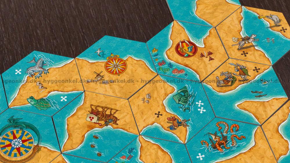 Spelets dubbelsidiga sexkantiga brickor ska sättas ihop till en karta som visar både land och hav.