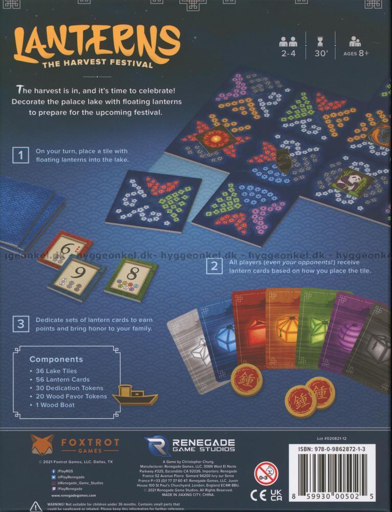 I Lanterns: The Harvest Festival har spelarna en handfull brickor som illustrerar olika färgarrangemang på flytande lyktor (det är 4 färger på varje bricka).